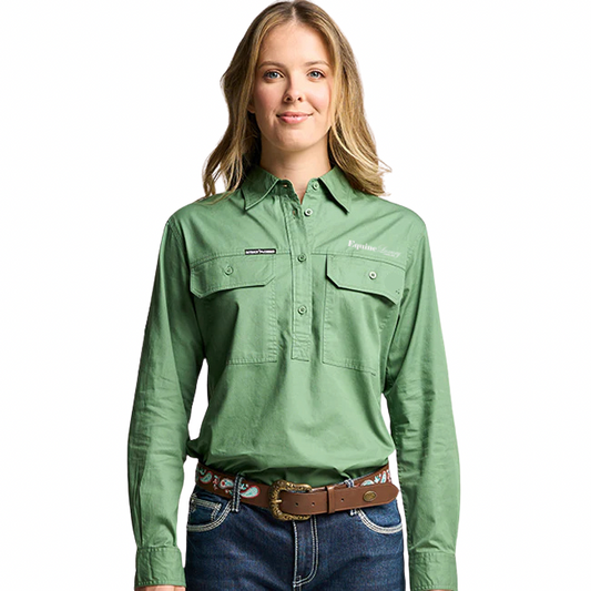 EquineLuxury Womens Half Button Long Sleeve Work Shirt - Gum Leaf Green