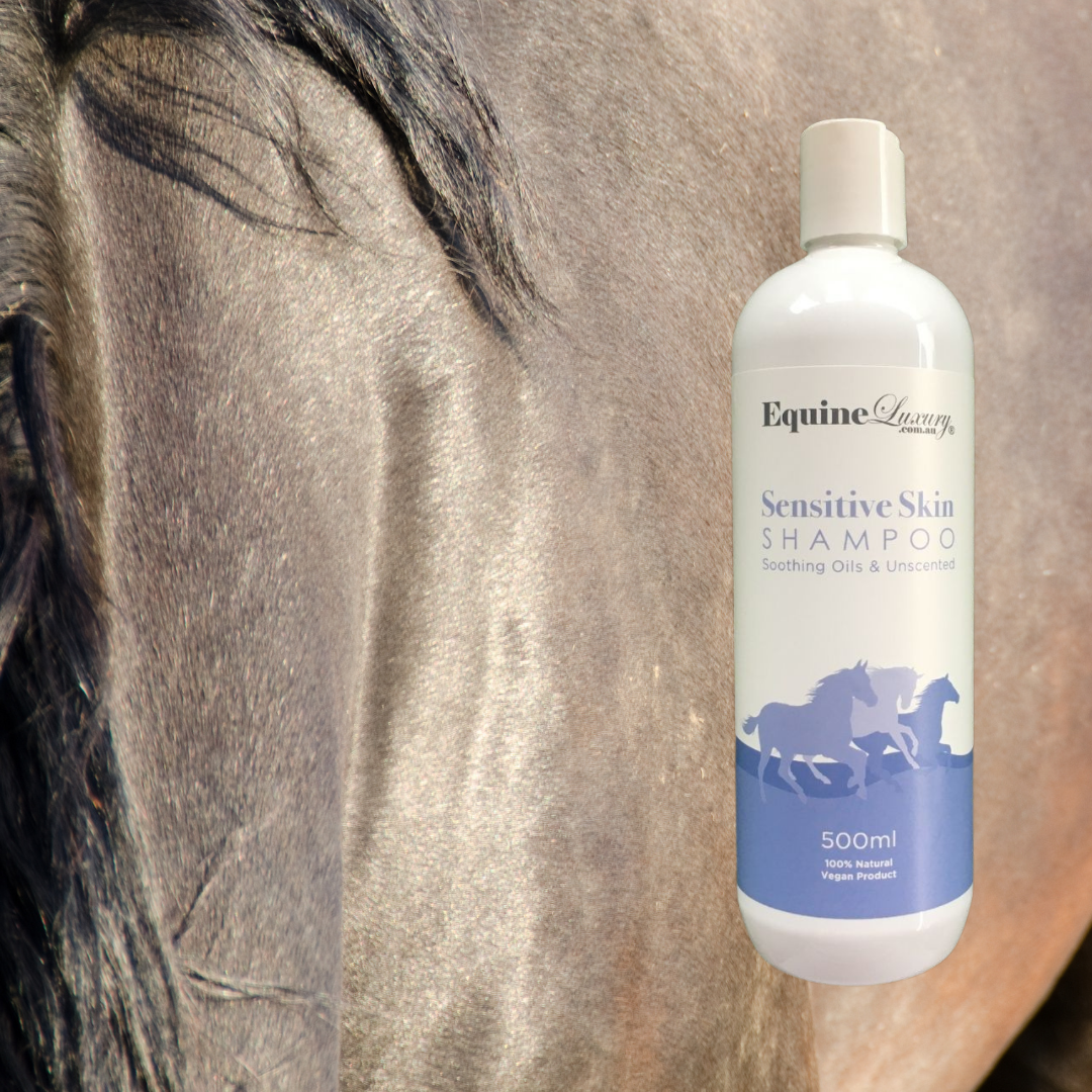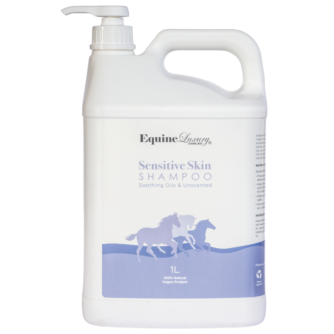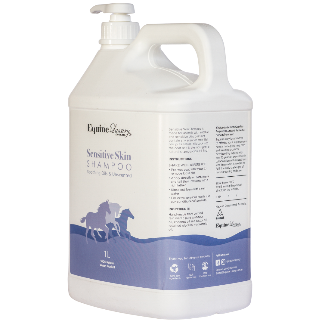 EquineLuxury “Sensitive Skin” 100% Natural Horse Shampoo does not contain any scent or essential oils. It is made for horses and pets with irritable and sensitive skin. By keeping the Natural Glycerin in the Shampoo, it is extra gentle and restores the coat by putting natural oils back into your animal's coat. The most gentle natural Shampoo you will ever find!